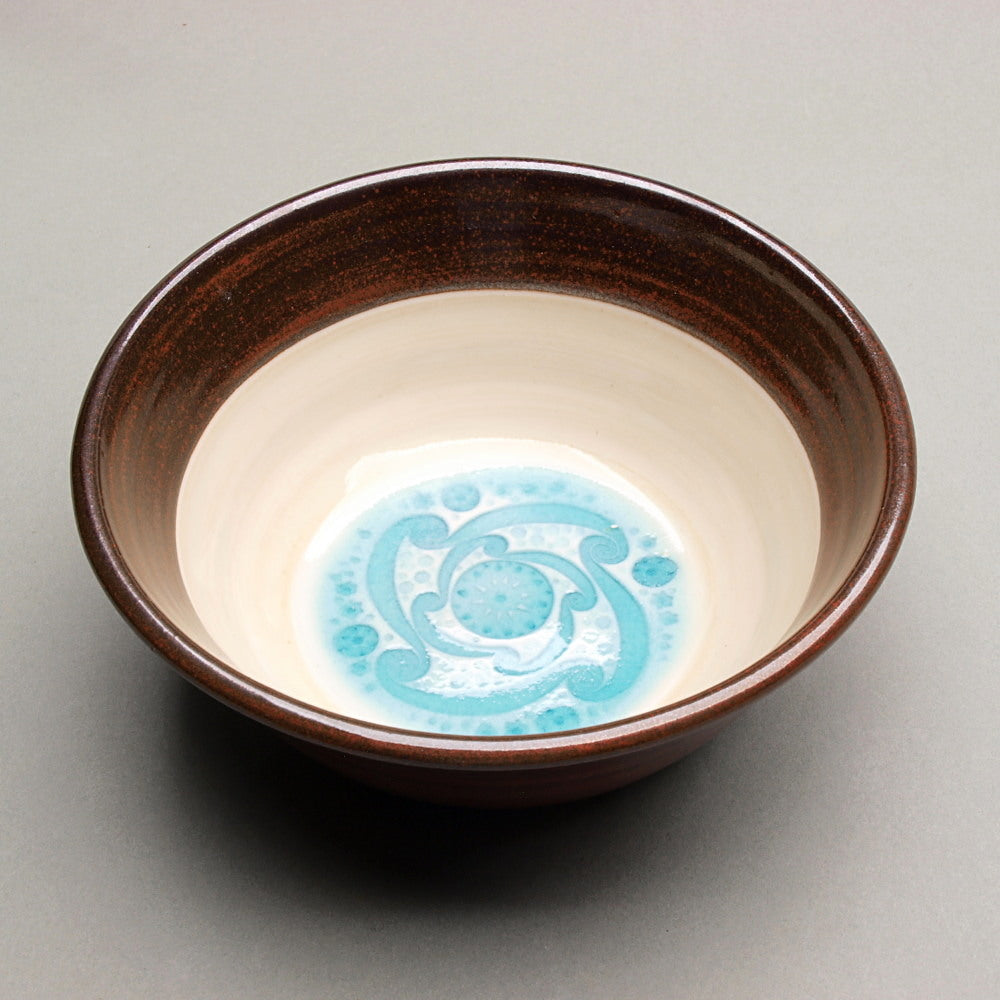 Elevate your home decor with this exquisite porcelain serving bowl. Handcrafted by Mike Hays on the pottery wheel, it features a captivating whirlwind motif filled with a turquoise glaze. Fired to perfection at 2381°F, this glassy, scratch-resistant masterpiece complements any interior theme. Not only is it a high-quality serving bowl, but it's also microwave and dishwasher safe for your convenience. Add a touch of elegance to your space. 6.5" dia. 2.5" tall🔥