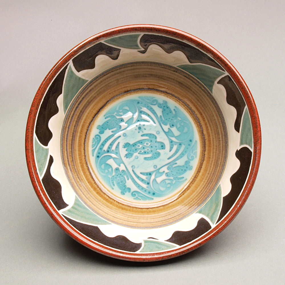 Elevate your home decor with this exquisite porcelain serving bowl. Handcrafted by Mike Hays on the pottery wheel, it features a captivating tortoises in the waves Motif filled with a turquoise glaze. Fired to perfection at 2381°F, this glassy, scratch-resistant masterpiece complements any interior theme. Not only is it a high-quality serving bowl, but it's also microwave and dishwasher safe for your convenience. Add a touch of elegance to your space. 8" dia. 3" tall
