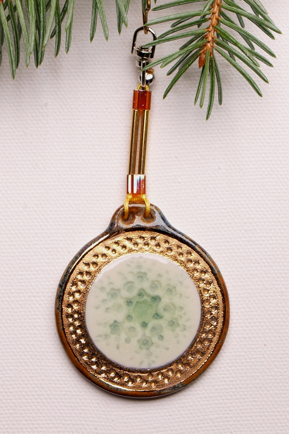 Bring winter magic to your holiday décor with this handcrafted porcelain snowflake ornament by Mike Hays. Adorned with a real 24k sparkling gold luster band, the intricate design catches and reflects light beautifully, while gold tone tube beads, and opalescent glass beads evoke the crystalline sparkle of winter ice. This ornament is both elegant and enduring—crafted to be treasured year after year. More than decoration, it’s a keepsake that blends artistry with tradition, perfect for Christmas, Hanukkah, or any seasonal celebration. A thoughtful gift or heirloom in the making, it adds timeless charm to your tree, window, or festive display.