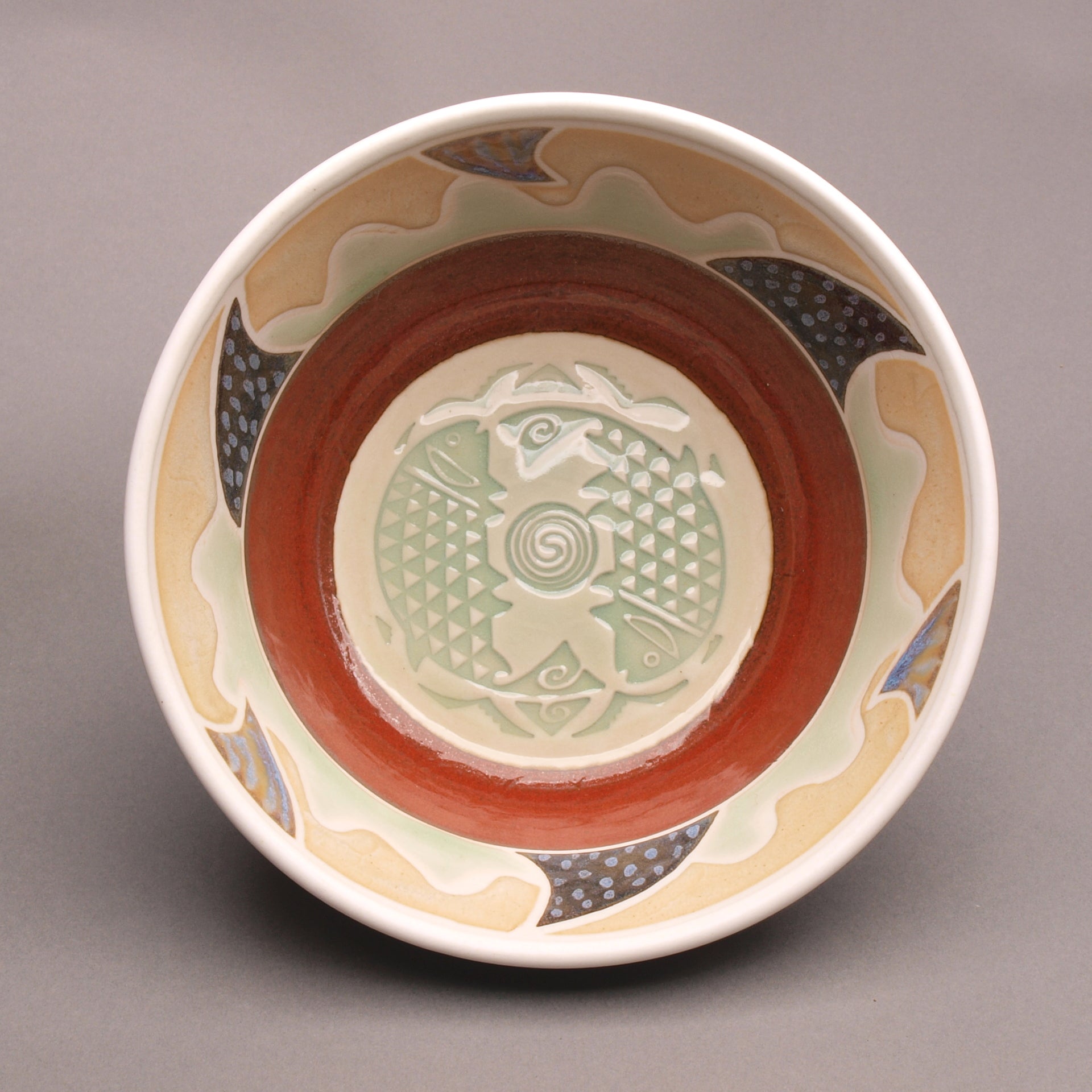 Elevate your home decor with this exquisite porcelain serving bowl. Handcrafted by Mike Hays on the pottery wheel, it features a captivating depiction of two fish in a Mimbres style pattern, filled with a light yellow-green glaze. Fired to perfection at 2381°F, this glassy, scratch-resistant masterpiece complements any interior theme. Not only is it a high-quality serving bowl, but it's also microwave and dishwasher safe for your convenience. Add a touch of elegance to your space. 9" dia. 3 3/8" tall.